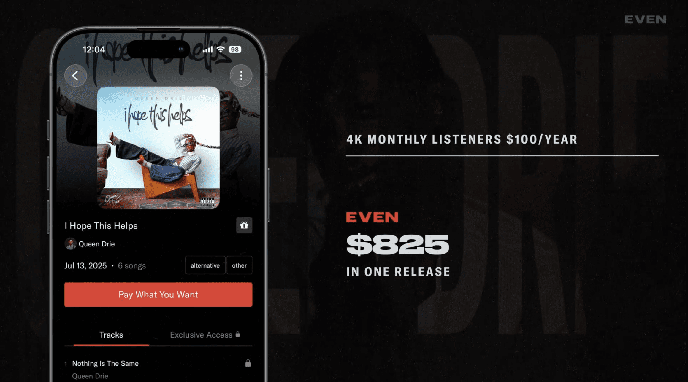 Queen Dre has 4,000 monthly listeners and makes about $100 a year from streaming. On her first release on EVEN, she made $825. That’s the equivalent of almost eight years of streaming from a single release.
