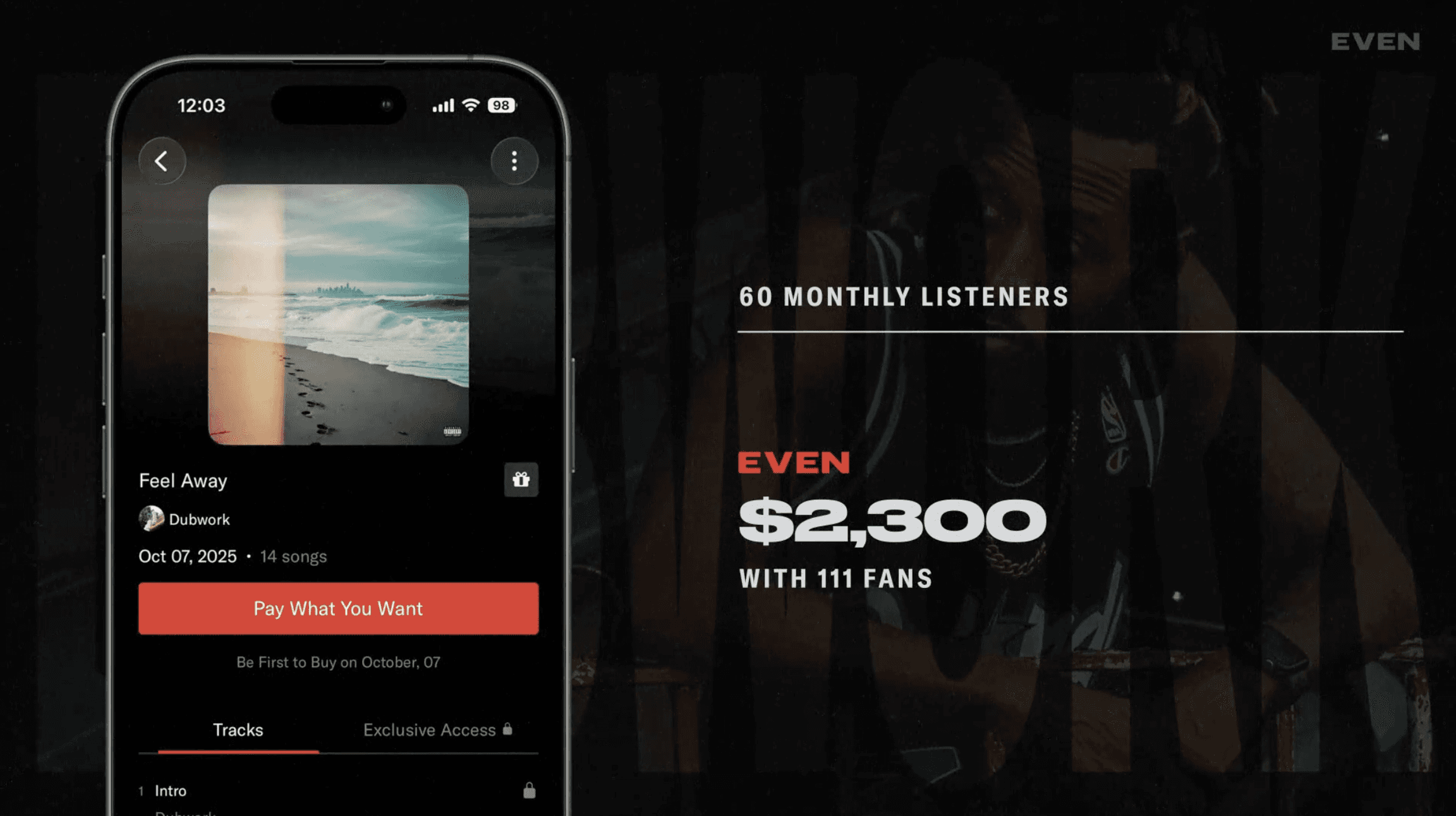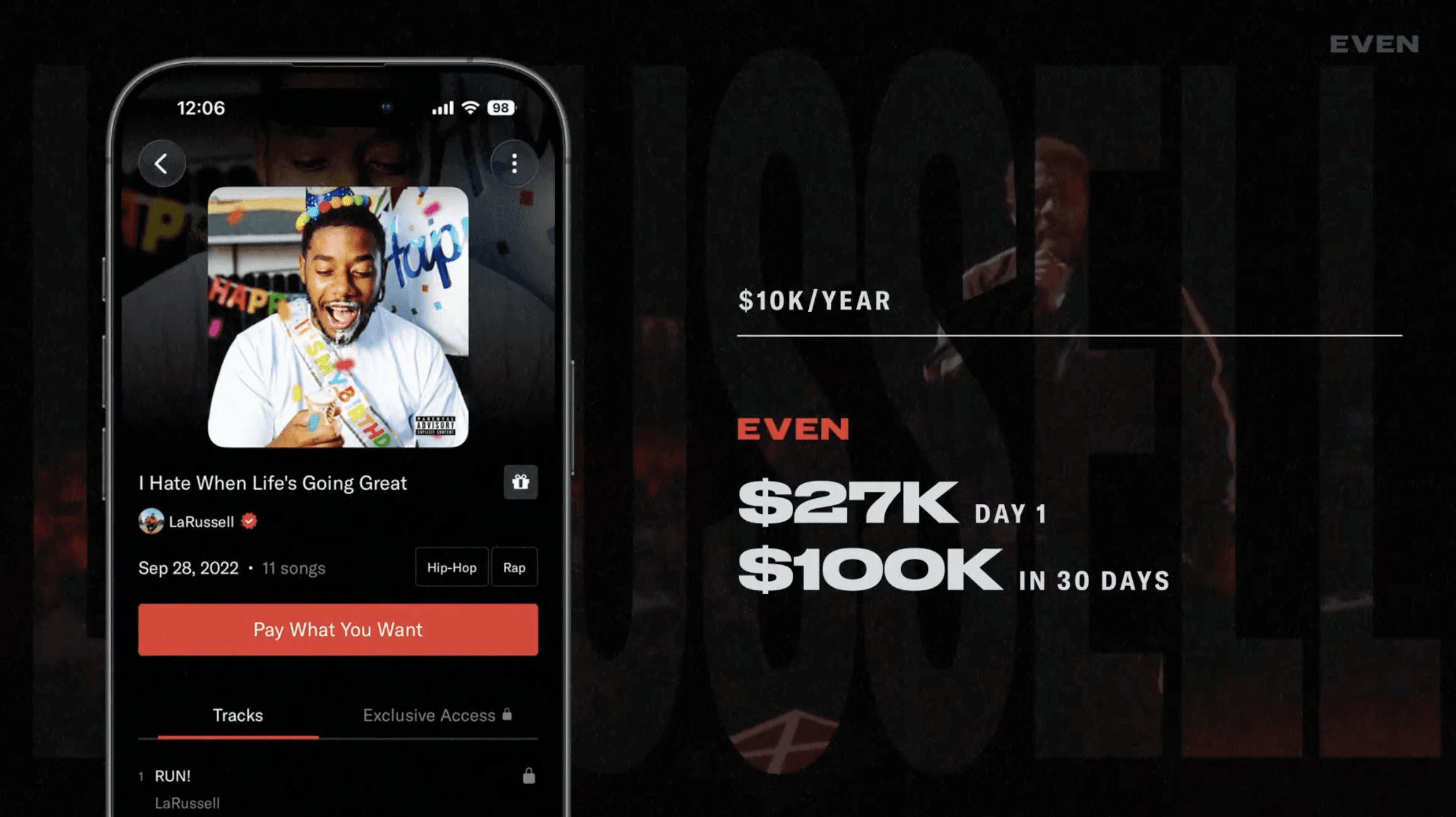 LaRussell was one of the first artists on EVEN. When he joined, he was making about $10,000 a year from streaming. He made $27,000 his first day on the platform. He went on to make over $100,000 in his first 30 days. This was LaRussell before the LaRussell you know today, but this direct-to-consumer before streaming strategy has become the foundation of how he releases everything, whether it’s tickets, merchandise, or experiences.